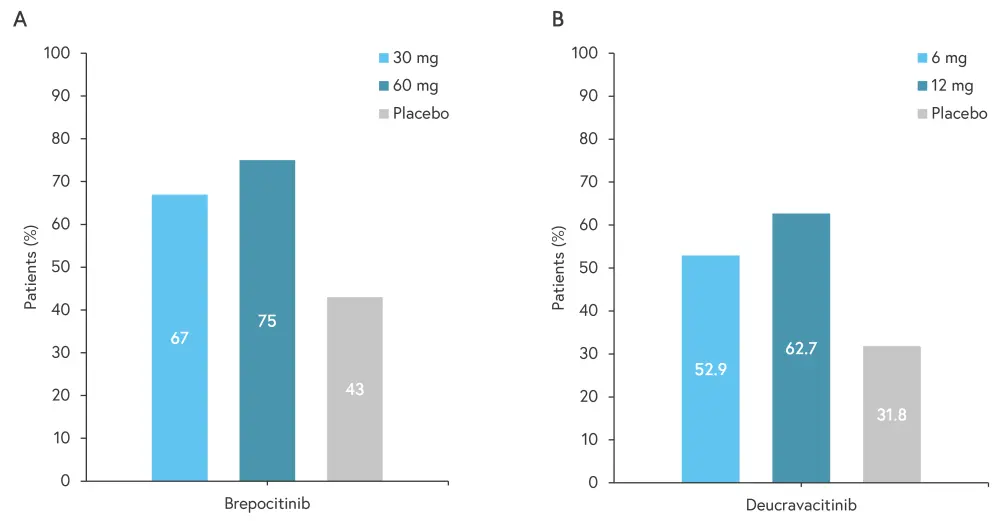Figure 3. Percentage of patients achieving ACR20 when treated with A brepocitinib and B deucravacitinib*
