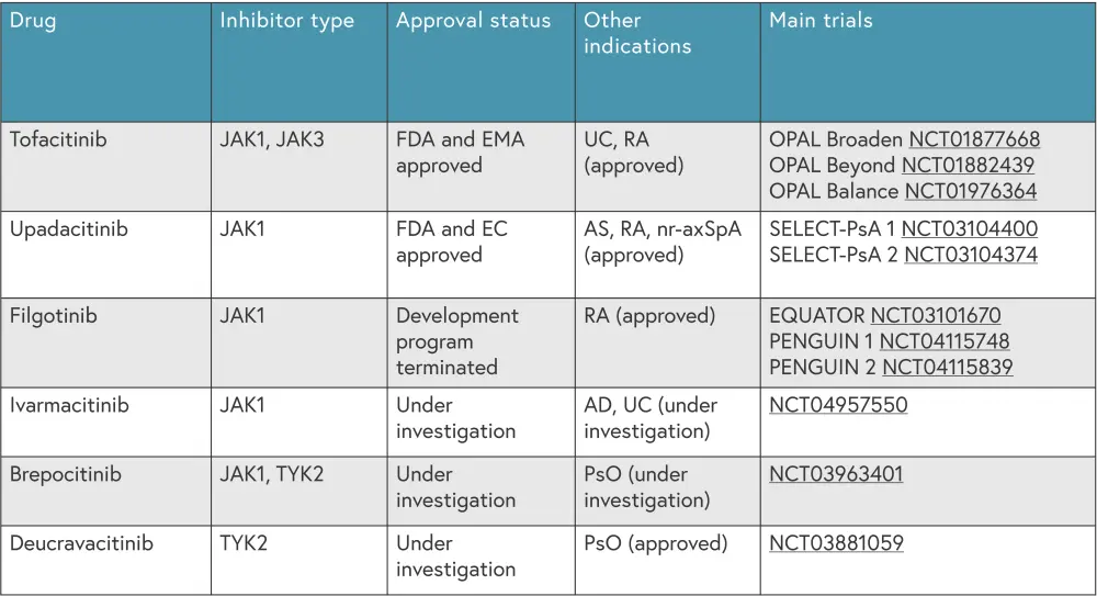 An outline of JAK inhibitors currently approved and under investigation for PsA is shown in Figure 2.