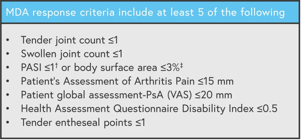 ACR50, American College of Rheumatology Criteria ≥50% response; ACR70, ACR criteria ≥70% response; HAQ-DI, Health Assessment Questionnaire-Disability Index; MDA, minimal disease activity; mNAPSI, modified nail psoriasis severity index; PASI90, 90% improvement in Psoriasis Area and Severity Index; PASI100, 100% improvement in PASI; PCS, Physical Component Summary; Q2W, every 2 weeks; Q4W, every 4 weeks; SF-36, Short-Form 36-item Health Survey; SJC, swollen joint count; TJC, tender joint count. |