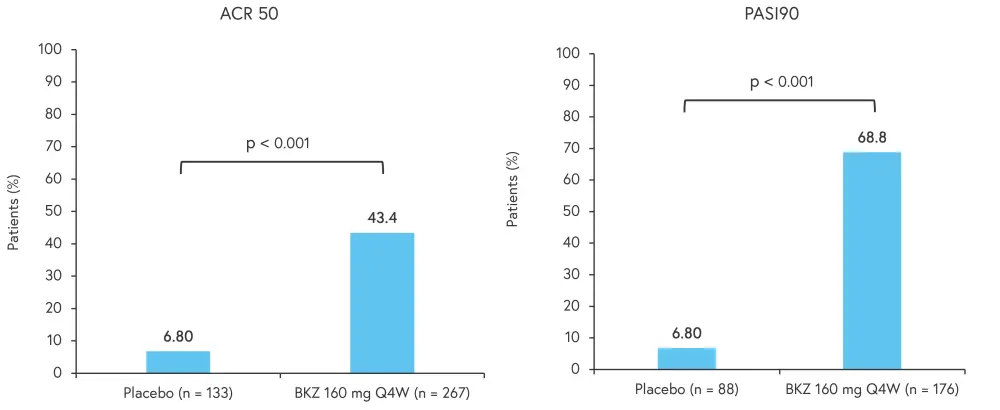 The primary endpoint was ACR 50 and secondary endpoints included PASI90, both showed a significant increase in the bimekizumab arm compared with placebo at Week 16 (p < 0.001; Figure 6).