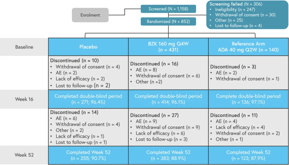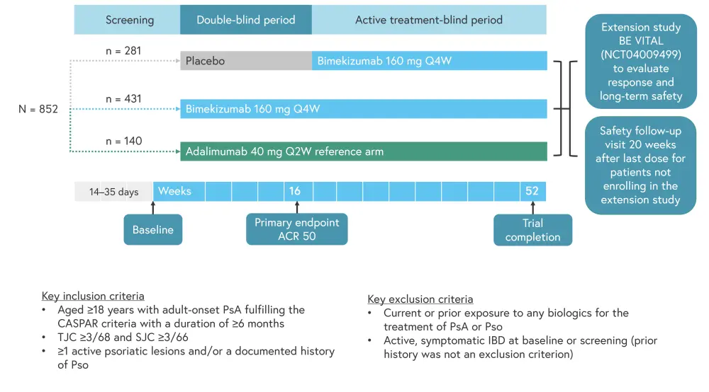 The BE OPTIMAL study enrolled 852 patients and was conducted over a 52-week period. Adalimumab was used as the reference arm for this trial, with patients in the placebo arm receiving open-label bimekizumab from Week 16 to 52. The study design is outlined in Figure 1.
