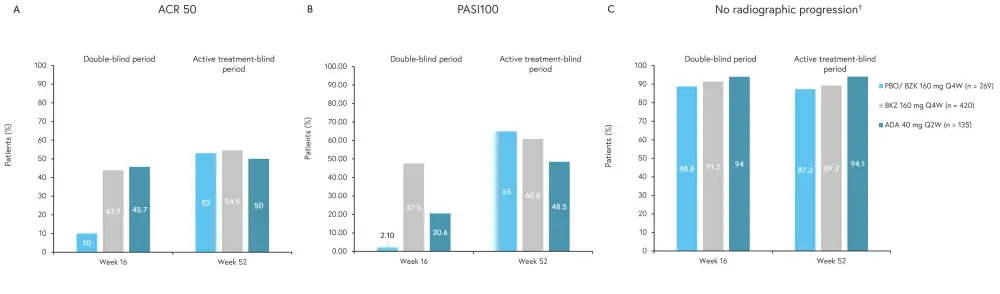 ACR 50, American College of Rheumatology Criteria ≥50% response; Ada, adalimumab; BZK, bimekizumab; PASI90, 90% improvement in Psoriasis Area and Severity Index; PBO, placebo; Q2W, every 2 weeks; Q4W, every 4 weeks.