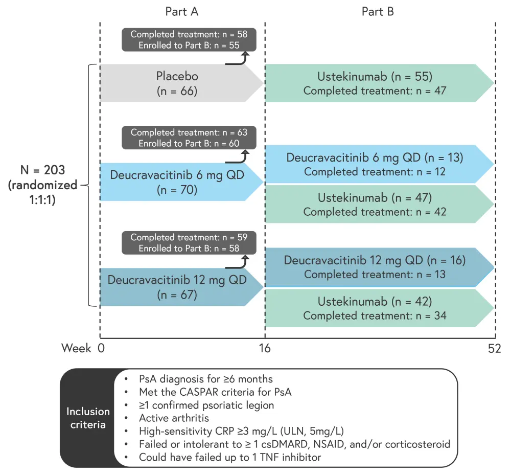 The study design is shown in Figure 1. Patients were initially randomized to either placebo or deucravacitinib 6 mg or 12 mg. If patients met minimal disease activity (MDA) at the end of 16 weeks of treatment with deucravacitinib, they were able to remain on deucravacitinib in Part B of the trial. If MDA was not met, patients were transferred to ustekinumab in Part B. Both Part A and B were blinded.