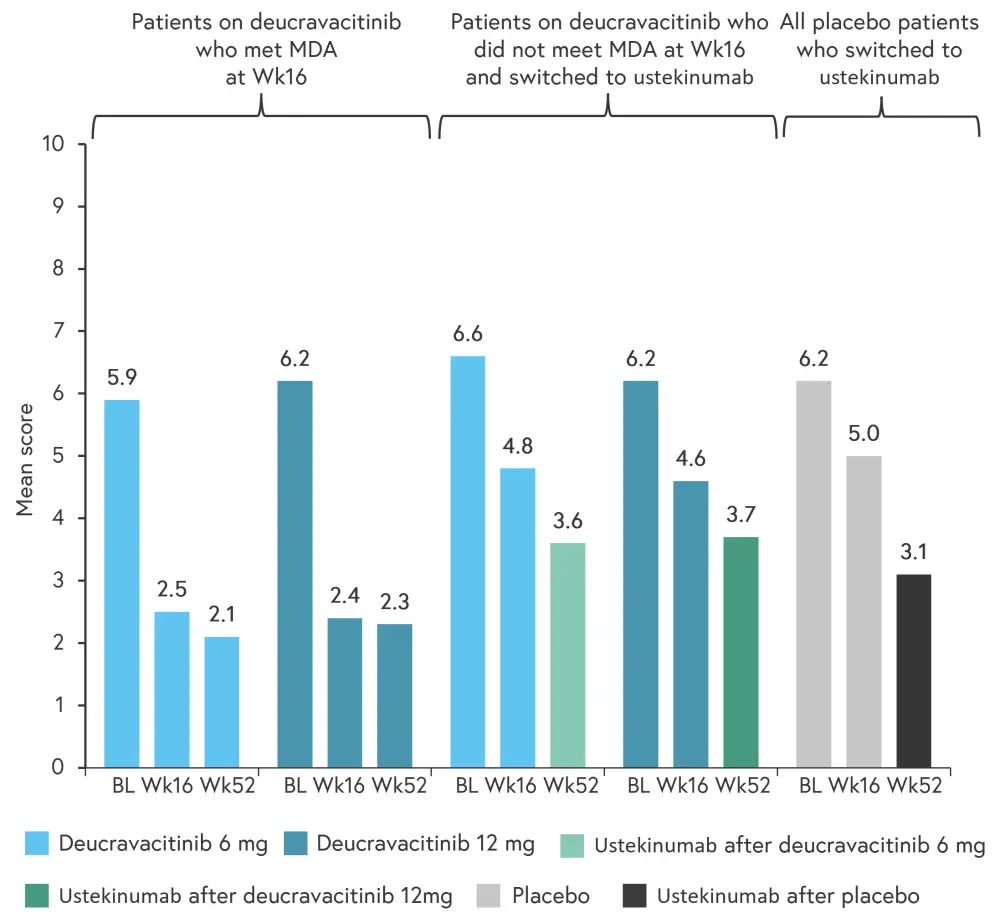 Patients treated with deucravacitinib through to Week 52 saw an ~3.5-point mean change in PASDAS score by Week 16 that was maintained to Week 52. Patients treated with deucravacitinib who did not meet MDA by Week 16 and placebo patients who switched to ustekinumab saw an ~3-point mean change in PASDAS by Week 52.