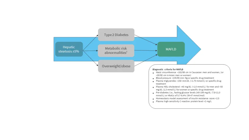 Recently, an international panel using a consensus-driven process proposed a concept for a new multi-systemic condition called ‘Metabolic Dysfunction-Associated Fatty Liver Disease’ (MAFLD), which includes metabolic disorders and is independent of alcohol consumption (Figure 1).6 The diagnostic criteria do not require the absence of other liver diseases (unlike NAFLD).5 This reflects the complex metabolic dysregulation pathways involved in this disorder, and it may be helpful in identifying patients at high risk for this condition.7