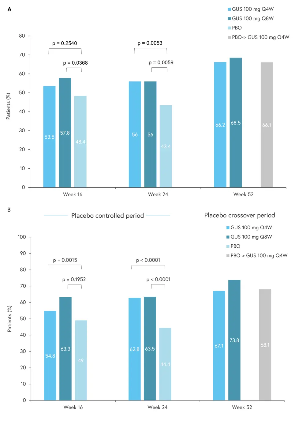 The DISCOVER-1 trial met its primary endpoint, ACR20 at Week 24 was achieved by 59% of patients treated every 4 weeks and 52% of those treated every 8 weeks, compared with 22% in the placebo group.1 Similar results were achieved in the phase III DISCOVER -2 trial, with 64% of all patients treated with guselkumab achieving ACR20 response at Week 24 compared with 33% in the placebo group.2 As a result of these studies, guselkumab received approvals from the U.S. Food and Drug Administration (FDA) and the European Commission (EC) in 2020.
