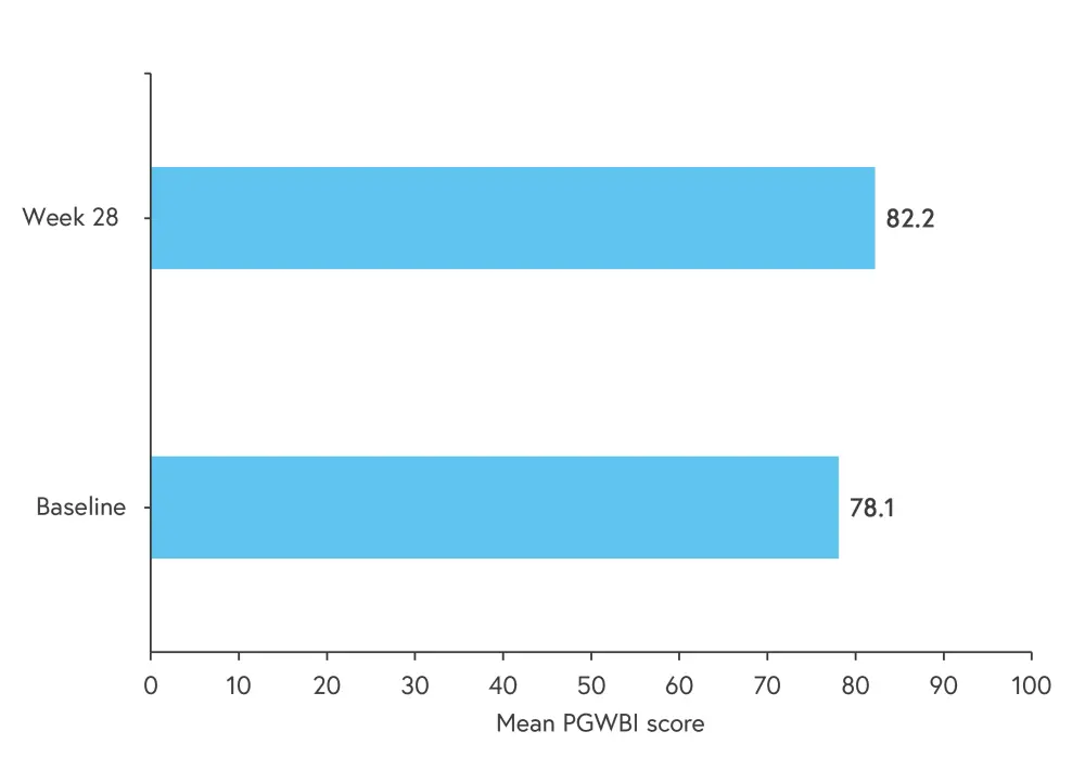 Changes for each PGWBI domain from baseline to Week 28 are shown in Table 1. Notably, the changes in anxiety and vitality domain scores were not statistically significant.