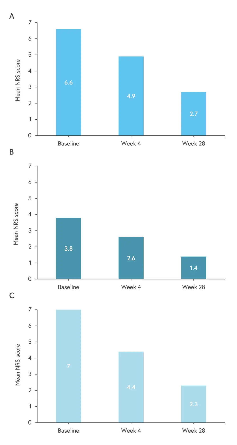 Figure 2. NRS scores for A itch, B pain, and C scaling in patients treated with tildrakizumab from baseline to Week 28*