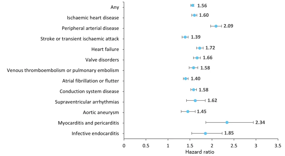 The primary endpoint of the study was the presentation of cardiovascular disease, with 12 cardiovascular conditions evaluated. Autoimmune diseases were considered individually and combined, in addition to analyses of subgroups of connective tissue diseases and organ-specific diseases. In combined analyses for patients with multiple autoimmune diseases, the first recorded autoimmune disease was used. Similarly, risk of each cardiovascular disease was considered individually and as a composite outcome of all 12 cardiovascular diseases included.