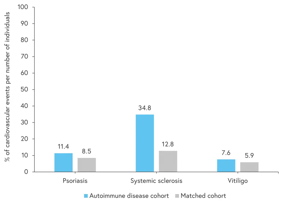 Figure 4. Percentage of cardiovascular events per number of individuals with psoriasis, systemic sclerosis, or vitiligo*