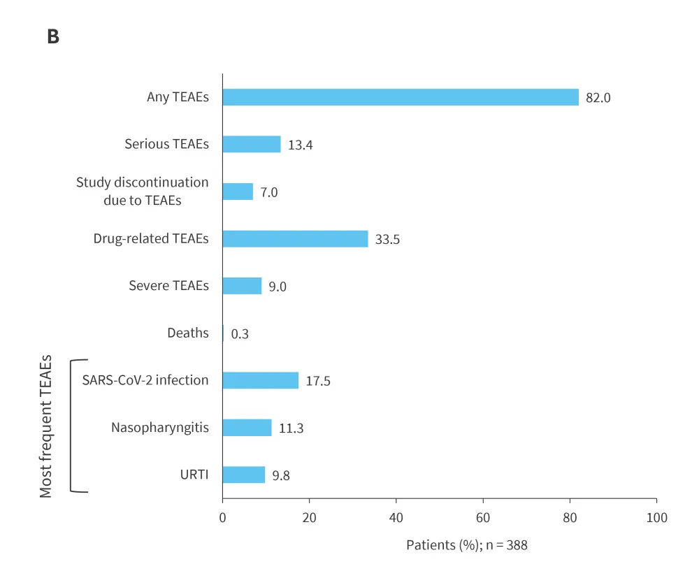 Patients who completed the 16-week BE COMPLETE trial subsequently entered the open-label extension study, BE VITAL (NCT04009499), in which those who previously received placebo were transitioned to bimekizumab. Sustained efficacy was observed from Year 1 through Year 3 across all assessed endpoints, including ≥50% improvement from baseline in American College of Rheumatology response criteria (ACR50), complete skin clearance measured by ≥100% improvement from baseline in Psoriasis Area and Severity Index (PASI100), minimal disease activity (MDA), and resolution of swollen joints (SJC = 0; Figure 1A).12 Bimekizumab was well tolerated over the extended treatment period, with no new safety signals identified (Figure 1B); Candida accounted for the majority of infections, which were largely mild/moderate in severity, with a low incidence of treatment discontinuation.12 Collectively, results from the BE COMPLETE and BE VITAL studies demonstrate that bimekizumab provides sustained and high levels of response for up to 3 years in patients with TNFi-IR PsA.12