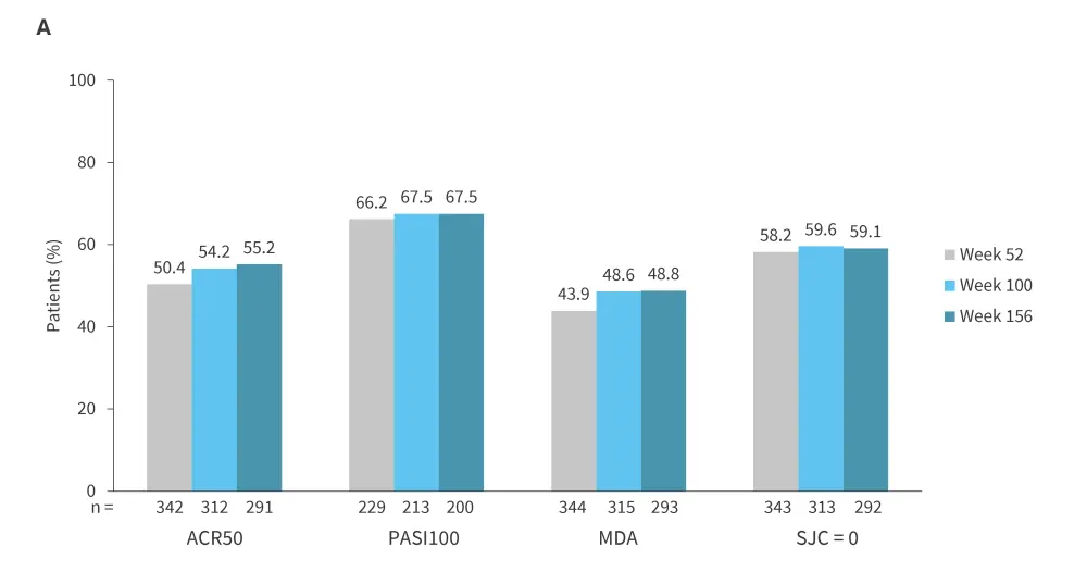 Patients completing the 24-week double-blind period entered a long-term extension period (Weeks 24–156; n = 310), during which those who previously received placebo were re-randomized to receive ixekizumab every 4 weeks (Q4W) and every 2 weeks (Q2W; 1:1).2 Clinical responses were maintained through Week 156, with ACR20 response rates of 84% and 85% in the Q4W and Q2W groups, respectively.2 These results support the long-term efficacy and durability of ixekizumab as a treatment option for patients with PsA with TNFi-IR.2