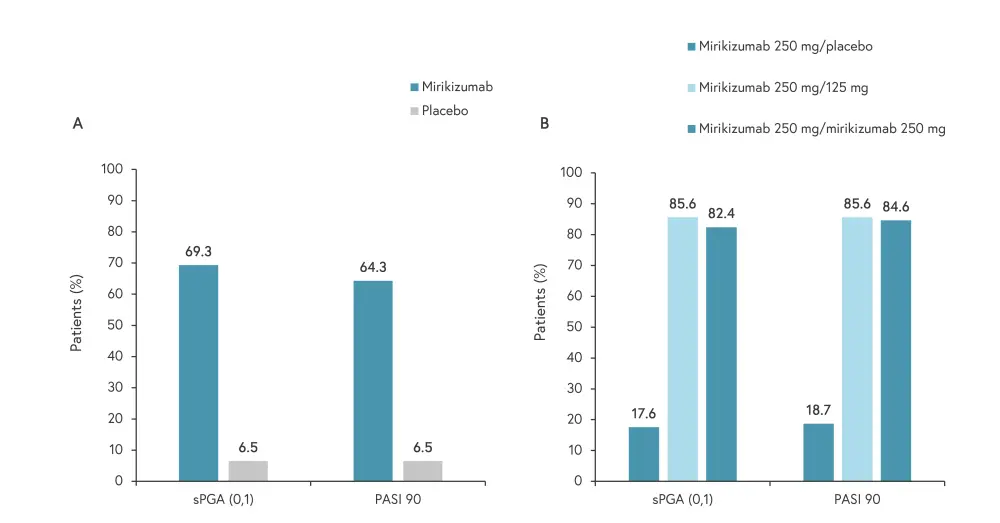 The primary outcomes were the proportion of mirikizumab treated patients achieving a static physician’s global assessment (sPGA) score of 0 or 1 compared with placebo at Week 16, a ≥2-point improvement from baseline, and the proportion of patients achieving PASI 90.