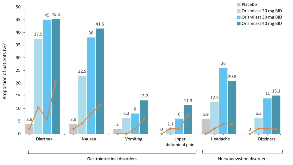 Dose dependent adverse events (AEs) were observed with orismilast (Table 2). Infections and depression rates were similar to placebo, with no malignancies or deaths reported.