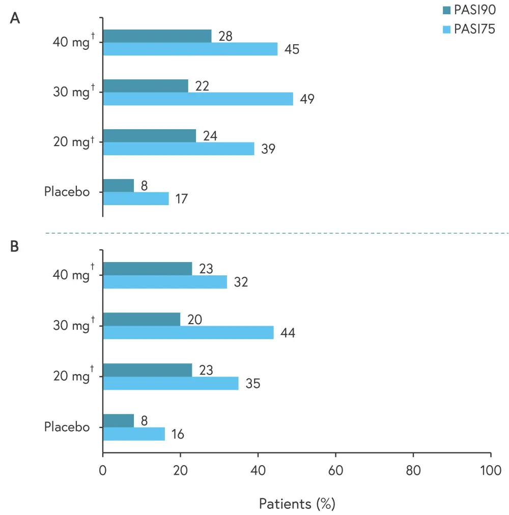 As per the multiple imputation (MI) and non-responder imputation (NRI) analysis, 20 mg and 40 mg doses showed significant improvement in PASI75 (≥75% reduction in PASI) and PASI90 (≥90% reduction in PASI; Figure 2).