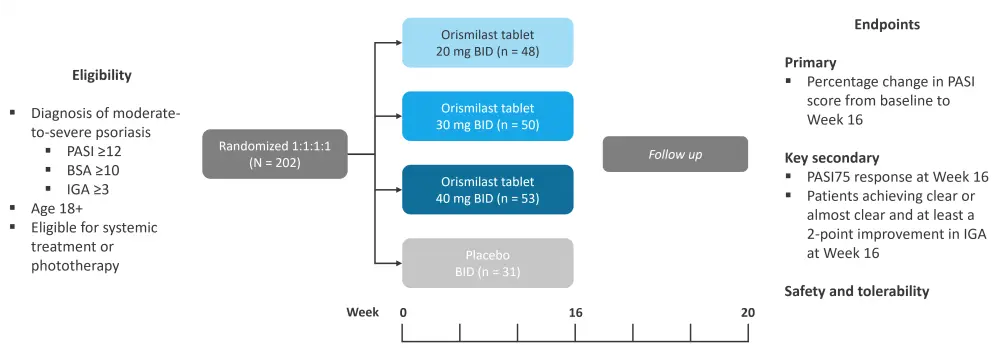The primary endpoint was met, with a significant reduction in Psoriasis Area and Severity Index (PASI) score with orismilast 20 mg (−53%; p < 0.001), 30 mg (−61%; p < 0.001), and 40 mg (−64%; p < 0.001) versus placebo (−17%) at Week 16.