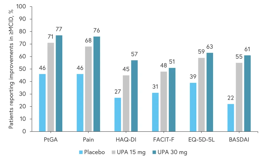 ≥MCID, at least a minimal clinically important difference; BASDAI, Bath Ankylosing Spondylitis Disease Activity Index; EQ-5D-5L, EuroQoL 5-Dimension 5-Level index score; FACIT-F, Functional Assessment of Chronic Illness Therapy-Fatigue; HAQ-DI, Health Assessment Questionnaire-Disability Index; PtGA, Patient Global Assessment Of Disease Activity; UPA, upadacitinib.