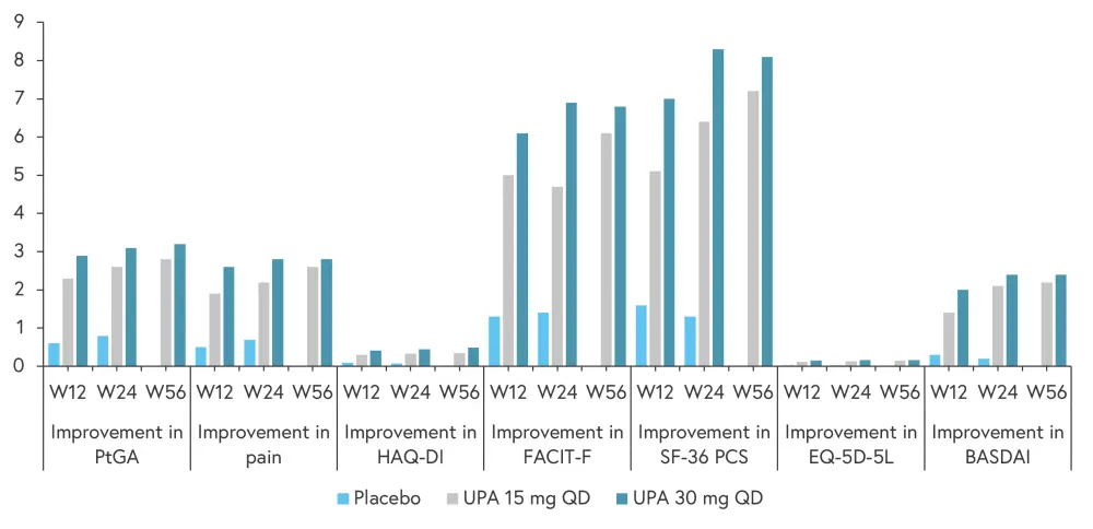 BASDAI, Bath Ankylosing Spondylitis Disease Activity Index; EQ-5D-5L, EuroQoL 5-Dimension 5-Level index score; FACIT-F, Functional Assessment of Chronic Illness Therapy-Fatigue; HAQ-DI, Health Assessment Questionnaire-Disability Index; PtGA, Patient Global Assessment Of Disease Activity; SF36 PCS, 36-Item Short Form Health Survey Physical Component Summary score; UPA, upadacitinib; W, week.
