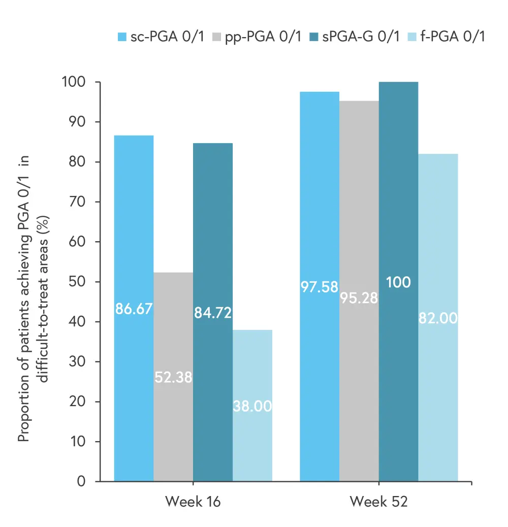 This was a 52-week retrospective study from two referral centers including 202 patients with moderate-to-severe involvement of at least 1 difficult-to-treat area, which was defined by site-specific Physician’s Global Assessment (PGA) ≥3.