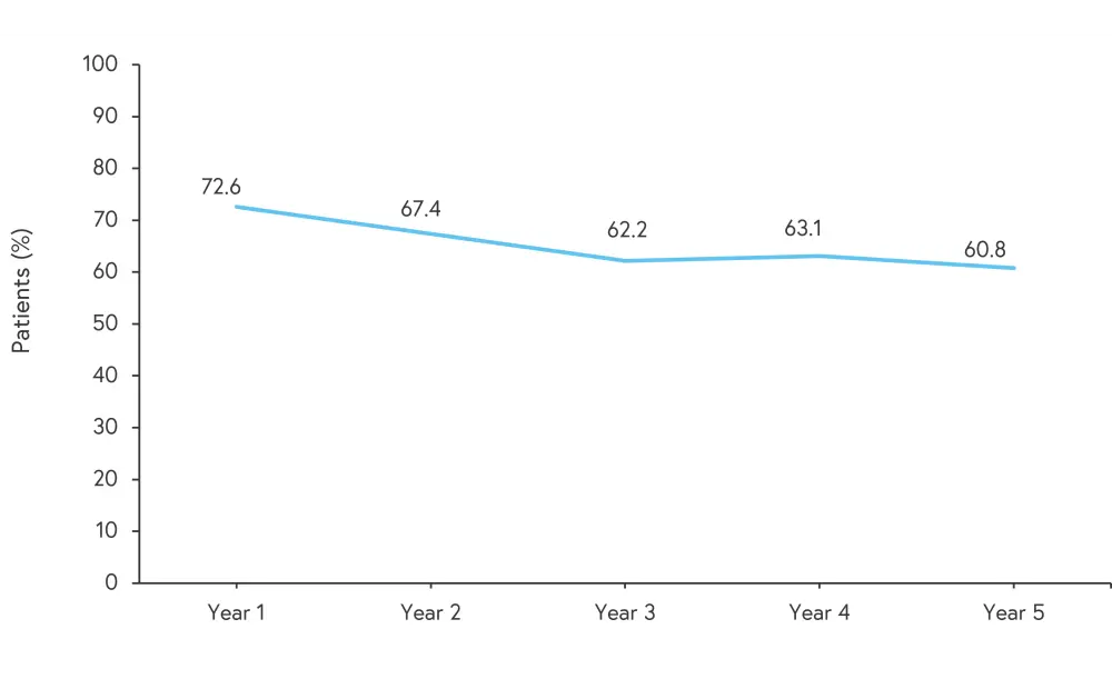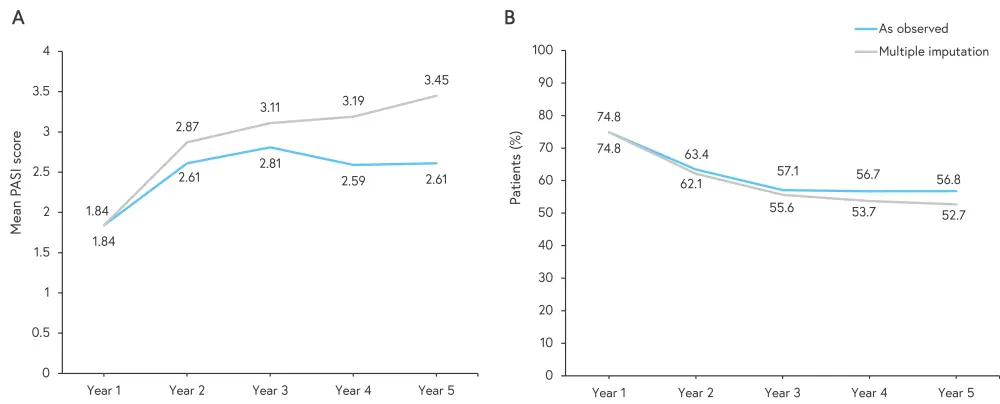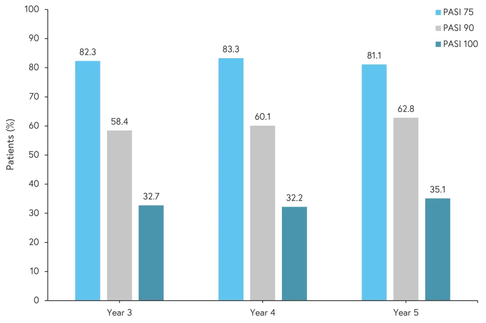 The proportion of patients treated with secukinumab 300 mg in both the response and partial-response groups achieving PASI 75, PASI 90, and PASI 100 remained consistent from Year 3 to 5, as shown in Figure 2.