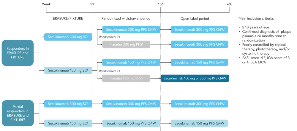 ‡In the core trials, patients received secukinumab 150 mg or 300 mg weekly from baseline to Week 4, then every 4 weeks to Week 48.