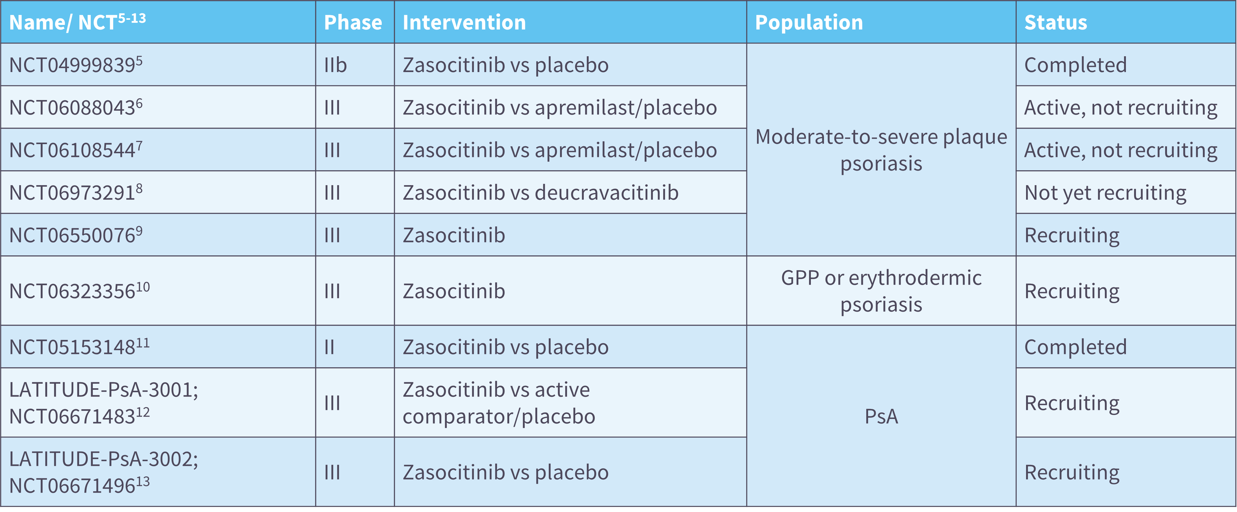 Zasocitinib is a TYK2 inhibitor in late-stage clinical development (Table 1)5–13 and has been found to be efficacious and tolerable in both PsO14 and PsA15 (Figure 1 and Figure 2).