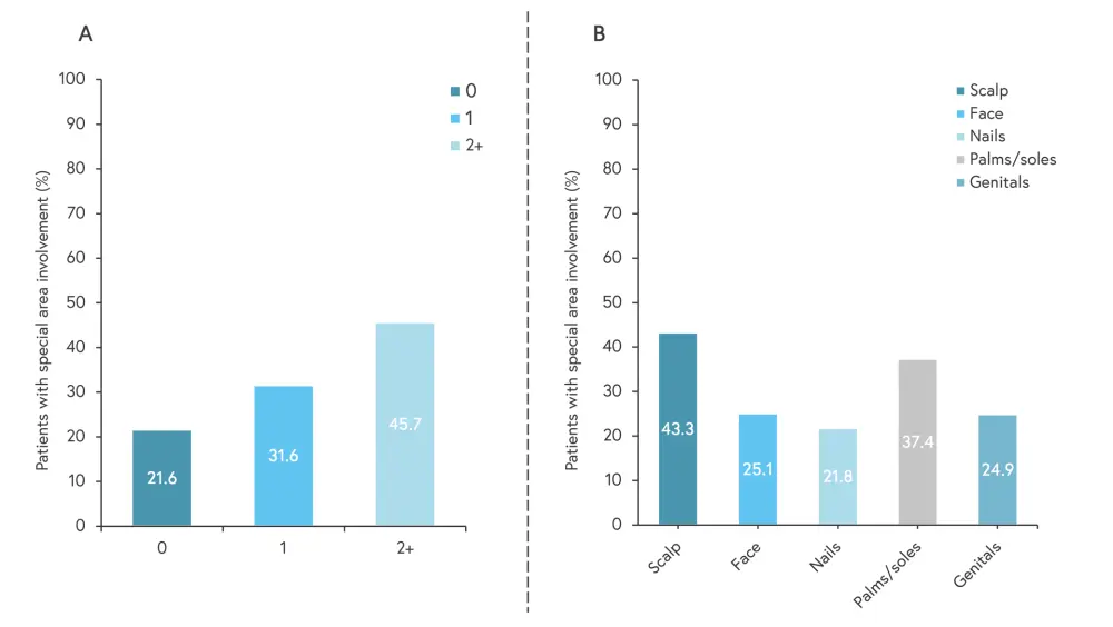 Figure 1. A Several special areas are involved, and B prevalence of special areas by body location*
