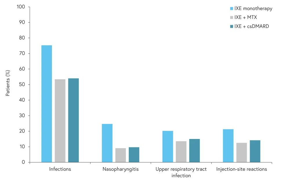 Across SPIRIT-P1 and SPIRIT-P2, 229 patients were randomized to receive IXE 80 mg once every 4 weeks and analyzed to assess safety and efficacy. The majority of treatment-emergent adverse events (TEAEs) were mild or moderate, with a higher rate of discontinuation due to adverse events in patients only receiving IXE, compared to patients on IXE with methotrexate or any csDMARD. All groups had similar safety findings, although the patients treated with IXE monotherapy generally had a higher incidence of TEAEs (Figure 2).