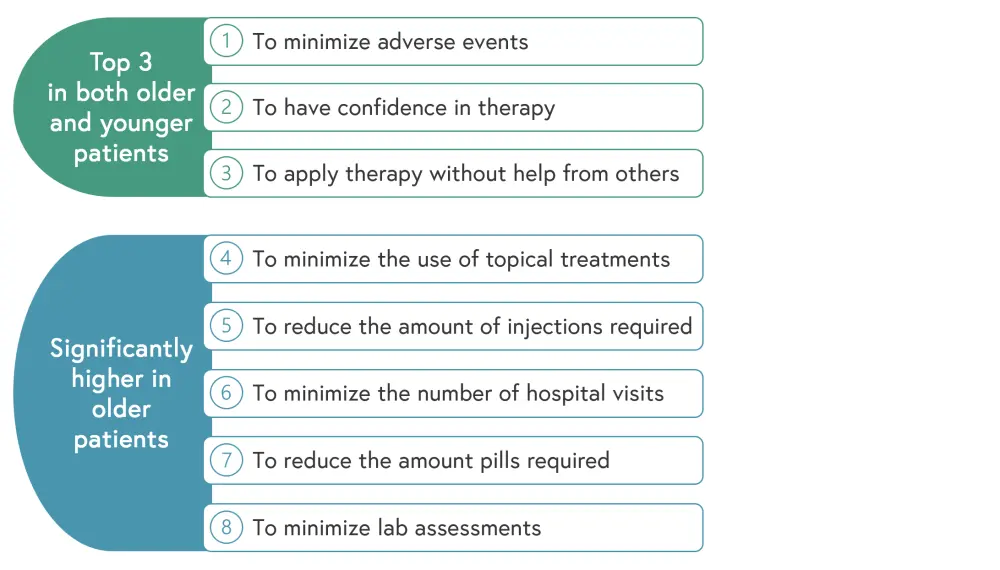 Reasons for these differences between treating younger and older patients included a concern that elderly populations may have more comorbidities and comedication. In turn, HCPs were concerned about adverse events (AEs), particularly irreversible AEs.