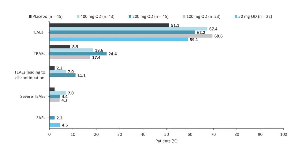 A phase IIb trial (NCT03895372) assessed the safety and efficacy of ropsacitinib in 178 adult patients with moderate-to-severe plaque psoriasis.12 Patients were randomized 1:1:2:2:2 to receive oral ropsacitinib once daily at 50 mg, 100 mg, 200 mg, or 400 mg, or placebo.12 At Week 16, more patients in the 200 mg (risk difference percent, 33.0; 95% confidence interval [CI], 18.0–47.1; p = 0.0004) and 400 mg (risk difference percent, 46.5; 95% CI, 30.6–60.6; p < 0.0001) treatment groups achieved PASI 90 vs placebo.12 The proportion of patients with AEs was similar between ropsacitinib treatment groups but numerically higher vs placebo (Figure 9).12