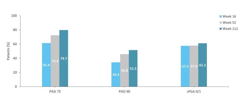 Figure 7. PASI 75, PASI 90, and sPGA 0/1 response rates in patients who continued deucravacitinib treatment until Week 112 in the POETYK-PSO-1 + POETYK-PSO-2 + POETYK LTE trials*
