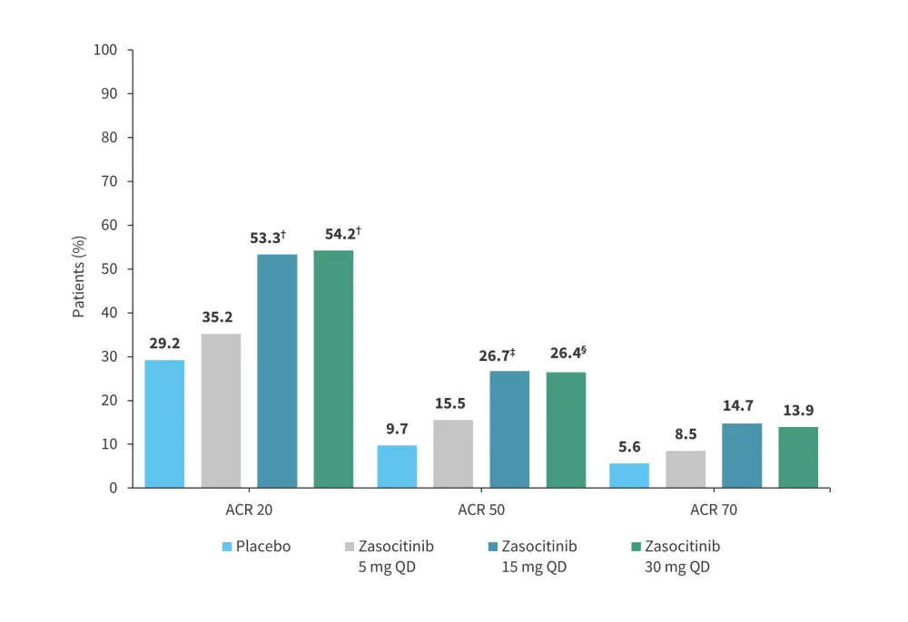 Another phase IIb trial (NCT05153148) assessed the safety and efficacy of zasocitinib in 290 adult patients with active psoriatic arthritis.14 Patients were randomized 1:1:1:1 to receive zasocitinib 5 mg, 15 mg, or 30 mg once daily, or placebo over 12 weeks.14 The primary endpoint was a 20% improvement in the American College of Rheumatology score (ACR 20) at Week 12.14 At Week 12, patients who received zasocitinib 15 mg and 30 mg achieved higher ACR 20 response rates vs placebo (Figure 13).14 The most common treatment-emergent AEs in patients treated with zasocitinib were nasopharyngitis, upper respiratory tract infection, headache, and rash.14 The rates of Grade ≥3 treatment-emergent AEs and serious treatment-emergent AEs were not higher at the 30 mg dose of zasocitinib (Table 6).