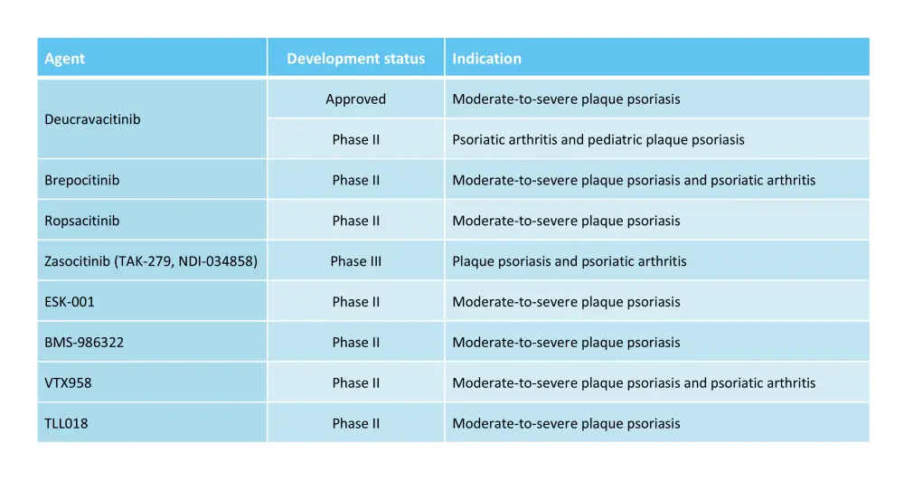 Currently, there are four oral TYK2 inhibitors approved or in late-stage clinical development: deucravacitinib, zasocitinib, and brepocitinib for psoriasis and psoriatic arthritis, and ropsacitinib for psoriasis.1,2,4 Additionally, several other TYK2 inhibitors are currently being investigated in clinical trials (Table 1).