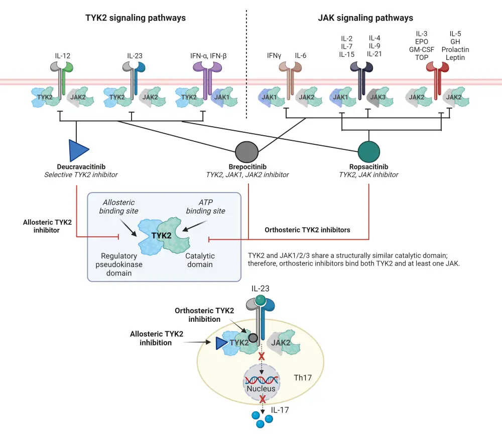 Inhibition of TYK2 signaling is possible by disrupting the connection between IL-23 and IL-17 (Figure 1).1 There are two categories of TYK2 inhibitors, allosteric inhibitors and orthosteric inhibitors.1 Allosteric inhibitors, such as deucravacitinib and zasocitinib, inhibit TYK2 enzymes by indirectly altering the shape of the enzyme by binding to a site other than the active site.1 Deucravacitinib selectively inhibits TYK2 by allosterically binding to the pseudokinase domain, blocking the receptor-mediated change necessary to bind to ATP, thus preventing activation and downstream signaling of IL-23, IL-12 and type 1 IFNs (Figure 1).1 Orthosteric inhibitors, including brepocitinib and ropsacitinib, compete with ATP for the binding to the active site of the catalytic domains (Figure 1).1