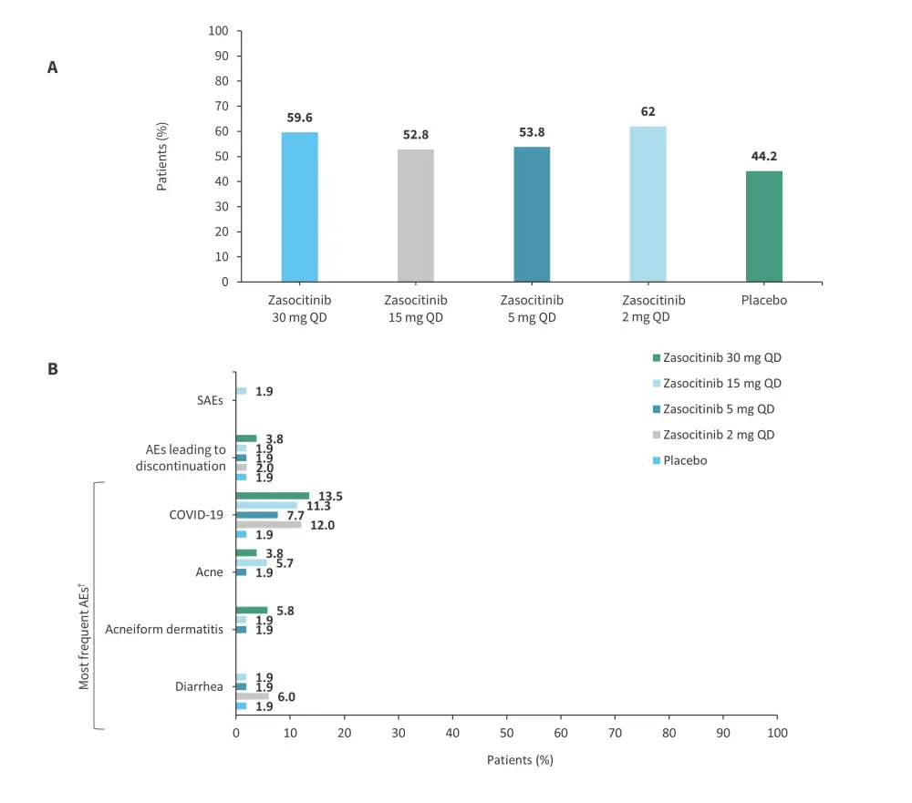 Figure 12. A The frequency of AEs and B type of AEs according to treatment arm in the phase IIb (NCT04999839) trial of zasocitinib*