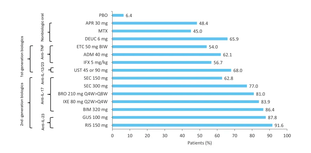 ADM, adalimumab; APR, apremilast; BIM, bimekizumab; BIW, twice weekly; BRO, brodalumab; DEUC, deucravacitinib; ETC, etanercept; GUS, guselkuma; IFX, infliximab; IL, interleukin; IXE, ixekizumab; MTX, methotrexate; PASI 75, ≥75% reduction in Psoriasis Area and Severity Index; PBO, placebo; Q2W, once every 2 weeks; Q4W, once every 4 weeks; Q8W, once every 8 weeks; RIS, risankizumab; SEC, secukinumab; TNF, tumor necrosis factor; UST, ustekinumab.