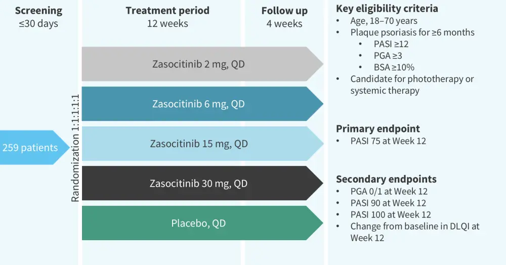 Psoriasis is a chronic, systemic, immune-mediated, inflammatory condition, affecting 2–3% of the global population, that can substantially impact patients’ quality of life (QoL).1,2 Current treatment options include topical medications, ultraviolet-based treatments, biologics, and oral small molecules.2 While biologics have improved outcomes for patients with psoriasis, they require intravenous or subcutaneous administration and may lose efficacy over time; therefore, oral small molecule inhibitors have the potential to improve patient adherence and QoL.1 Conventional non-targeted therapies are associated with adverse events (AEs) and long-term safety issues,1 meaning there is a clinical need for safe and efficacious novel oral targeted therapies for patients with psoriasis.1,2 Tyrosine kinase 2 (TYK2) inhibitors have recently been explored as a promising therapeutic approach in this patient population.3
