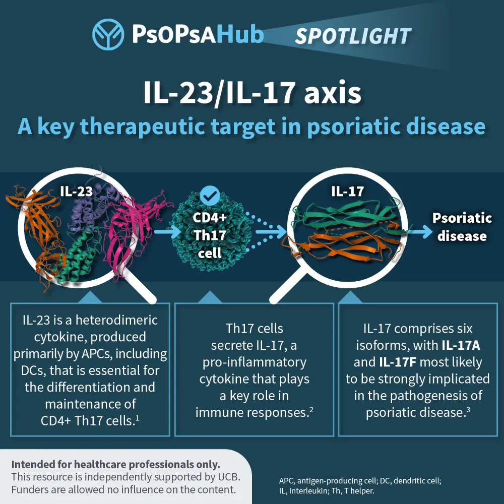 Below, we summarize the immunopathogenic role of the IL-23/IL-17 axis and its relevance as a therapeutic target in psoriatic disease.