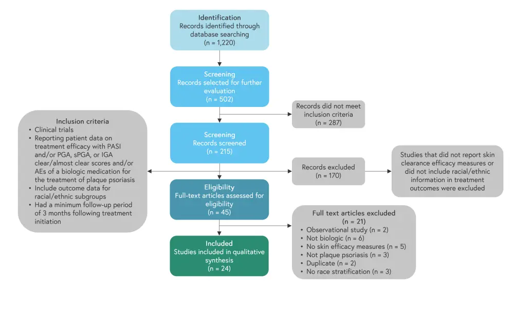 Studies were identified from PubMed, Embase, Web of Science, and EBSCO databases. All patients in the included 24 studies had plaque psoriasis; the search design in shown in Figure 1. Studies had similar inclusion criteria including ≥10% body surface area affected, a Psoriasis Area Severity Index (PASI) ≥12, and static Physician’s Global Assessment, Physician’s Global Assessment, or Investigator’s Global Assessment ≥3. All patients in the studies self-categorized their race/ethnicity.