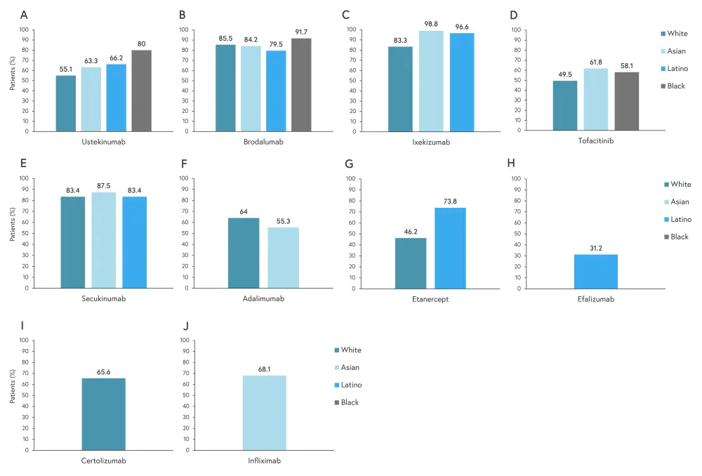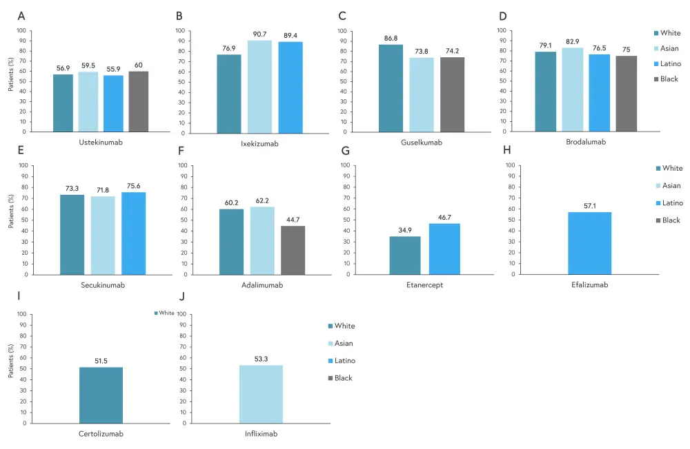 Of the treatments included, White patients saw the highest clear/almost clear response to guselkumab, Black patients had the highest response to brodalumab, and Asian and Latino patients had the highest response to ixekizumab. Treatment responses to ustekinumab and secukinumab were very similar across reported races/ethnicities, although more Black patients achieved PASI75 with ustekinumab treatment.