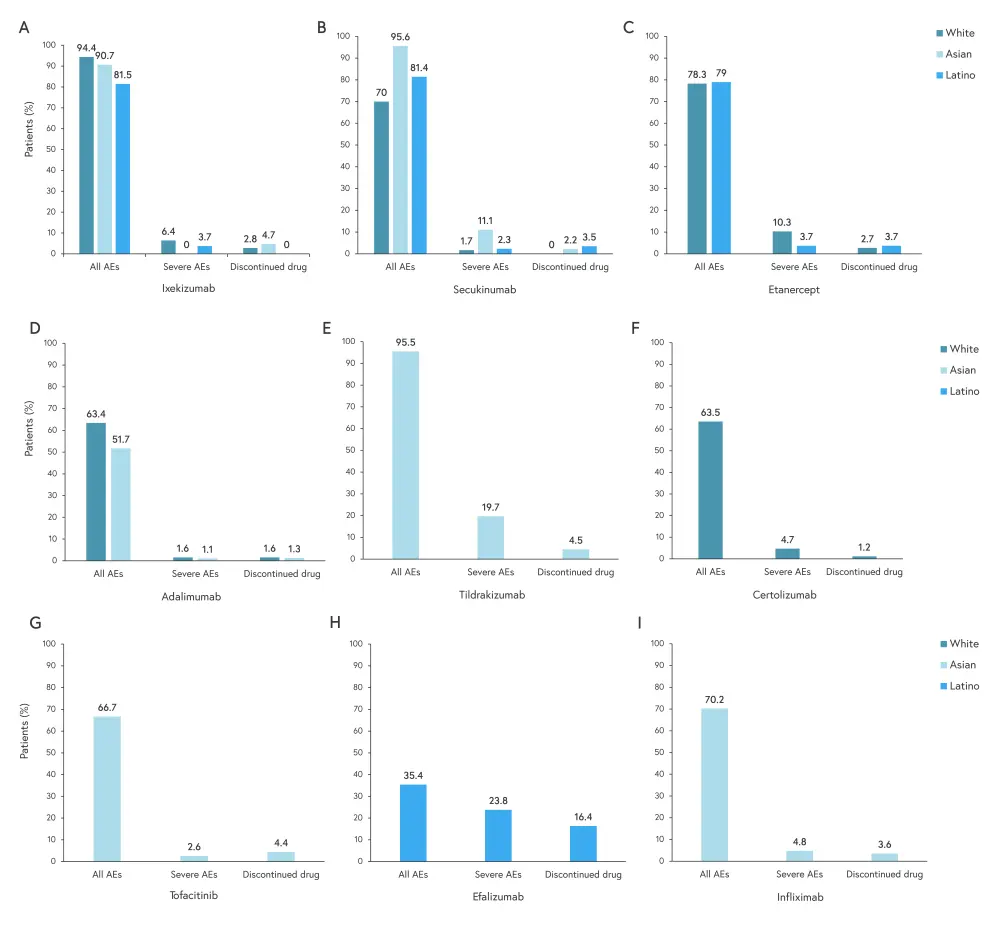 There was only one death reported in all included studies, an Asian patient who died during a study of adalimumab, which was caused by heart failure possibly related to treatment. The drug with the highest disparity in AE data between race and ethnicity was secukinumab, with Asian patients having the highest incidence of AEs and severe AEs.