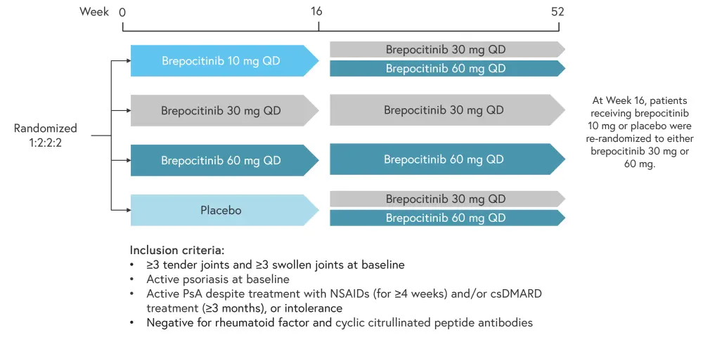 The primary endpoint of this study was the percentage of patients who achieved a 20% improvement in American College of Rheumatology response (ACR20) at Week 16. Key secondary endpoints included ACR70, 75% improvement in PASI (PASI75), and PASI90 responses.