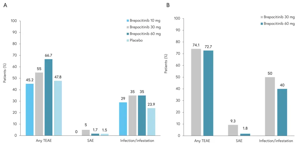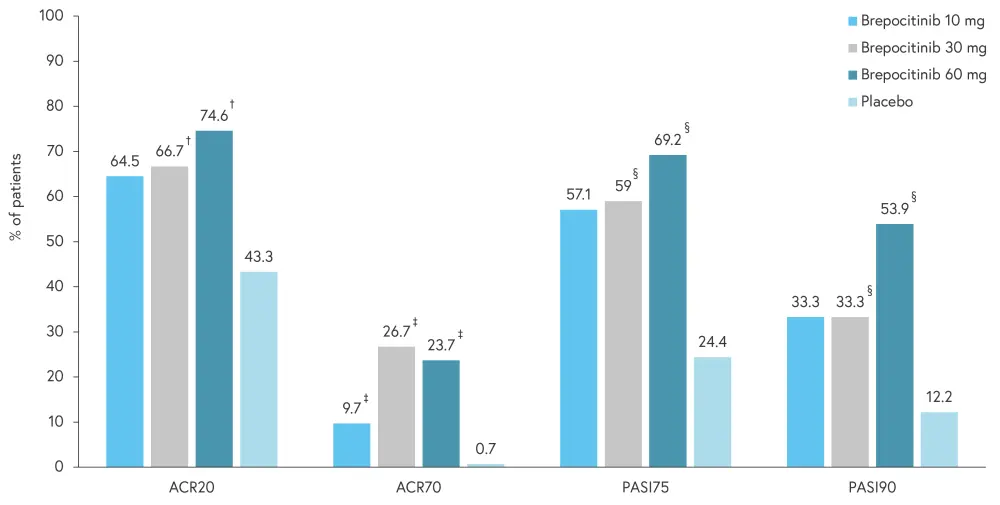 Significant improvements in patient-reported outcomes, such as Health Assessment Questionnaire – Disability Index, were also observed in cohorts treated with brepocitinib 30 mg and 60 mg compared with placebo. The ACR20, ACR70, PASI75, and PASI90 responses were generally sustained up to Week 52 in the brepocitinib 30 mg and 60 mg cohorts; however, improvements were observed more frequently in the 30 mg cohort.