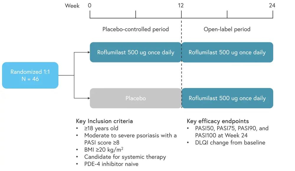Patients received either roflumilast 500 μg or placebo once daily, with no dose titration used. The primary endpoint of a 75% improvement in Psoriasis Area and Severity Index (PASI75) was assessed at Week 12, after which all patients were transitioned to roflumilast treatment. The study design is shown in Figure 1.