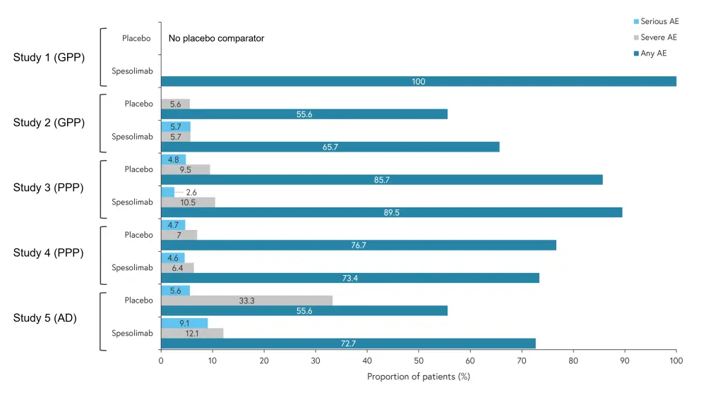 Rates of hypersensitivity (eczema, rash, allergic rhinitis, and drug reaction with eosinophilia and systemic symptoms), anaphylactic reactions (including circulatory collapse), and angioedema (eye oedema and urticoria) were evaluated in Studies 2, 4, and 5. There was a similar frequency of hypersensitivity between the placebo and spesolimab groups, with the highest frequency observed in Study 5 (33.3% and 44.4% in the spesolimab and placebo arms, respectively). Eosinophil values were also measured for all five trials, there was no evidence of eosinophilia associated with spesolimab treatment. High eosinophils (>1 × 109/L) were observed in two patients (28.6%) in Study 1 and four patients in the placebo (28.6%) and four patients in the spesolimab (12.9%) arm of Study 5. For all other trials, no patients in either arm were found to have a high eosinophil count. Although elevation in liver enzymes was recorded, this was not found to be associated with spesolimab treatment.