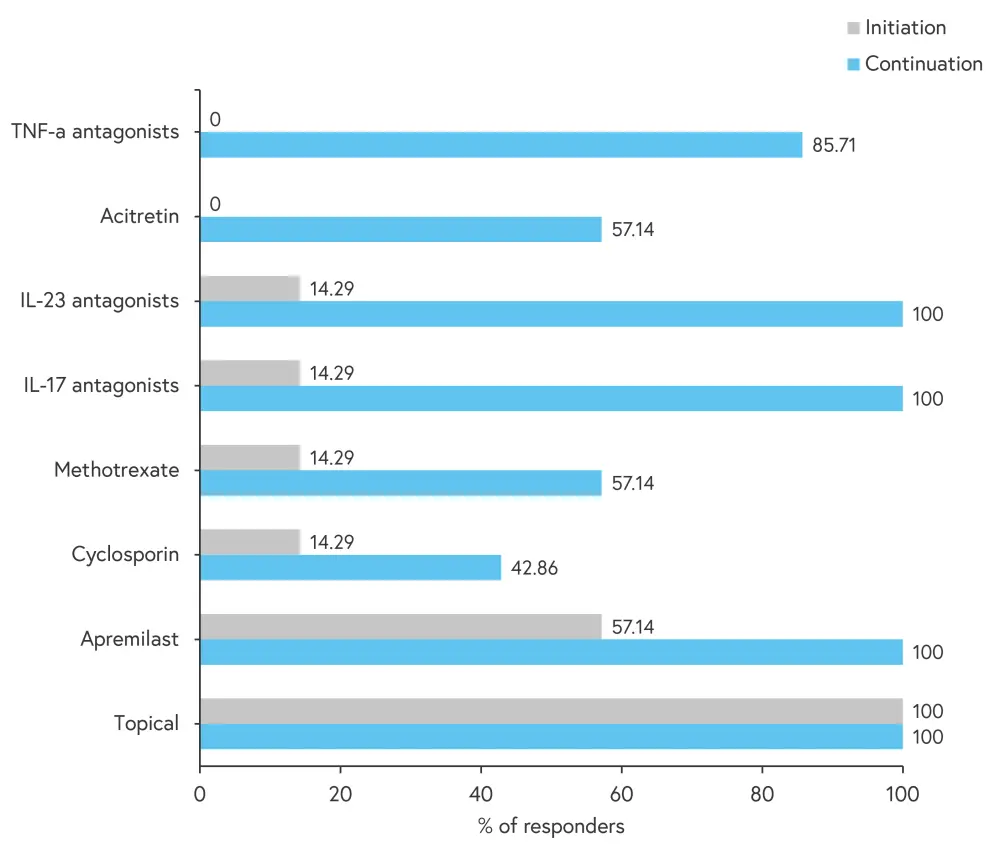 The working group members, excluding one member who no longer regularly treats patients, voted on which treatment initiation and continuation decisions may be determined using TM (Figure 5). All members agreed that TM could be used to make treatment initiation and continuation decisions for topical treatment. No other medication reached 100% consensus, but three other treatments, including apremilast and biologic agents, were considered suitable for continuation using TM by the entire panel.