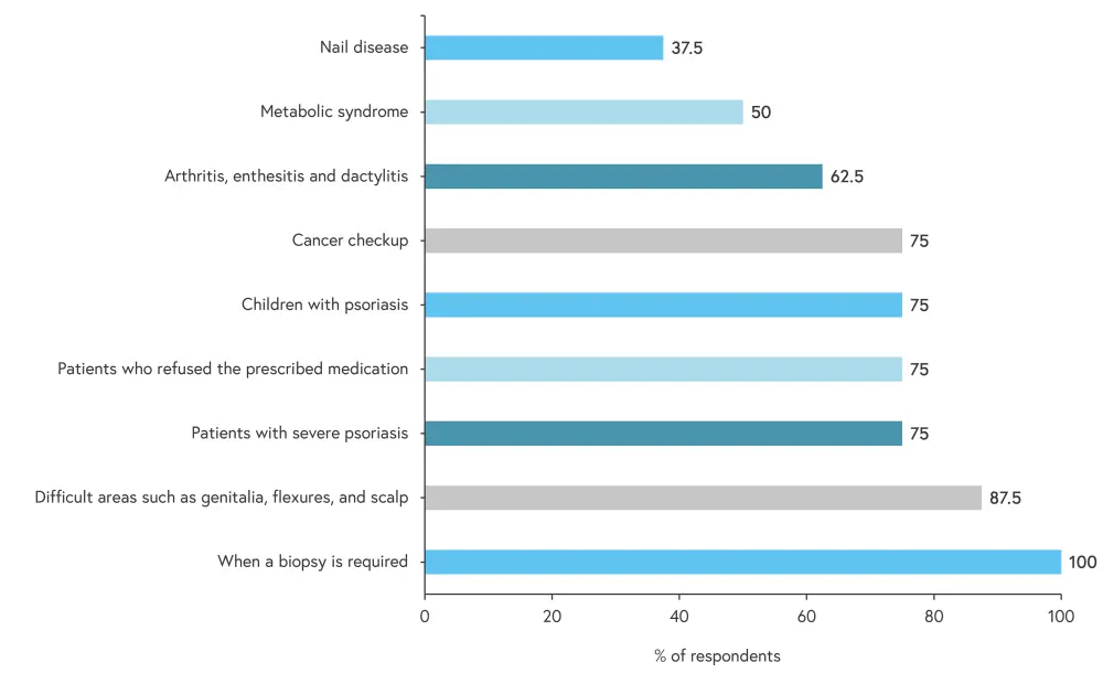 The use of TM can provide additional care that may not usually be available, such as internet-based cognitive behavioral therapy and mental health care. The IPC has a platform for discussing best practice treatment approaches and what teledermatology can offer to patients; they acknowledged that, in certain situations, TM is not the optimal approach. Figure 3 highlights situations in which an in-person visit is preferred.