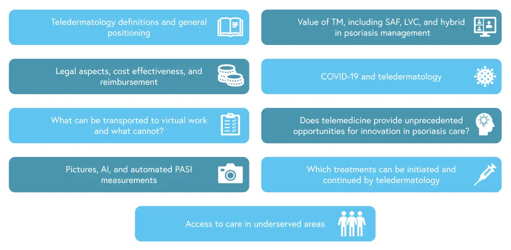 Members of the TM working group have clinical experience in treating psoriasis, competence in using TM, and exposure to teledermatology research. The group discussed various topics and provided statements on how TM could be optimized for patients with psoriasis. The main topics of discussion are shown in Figure 1.