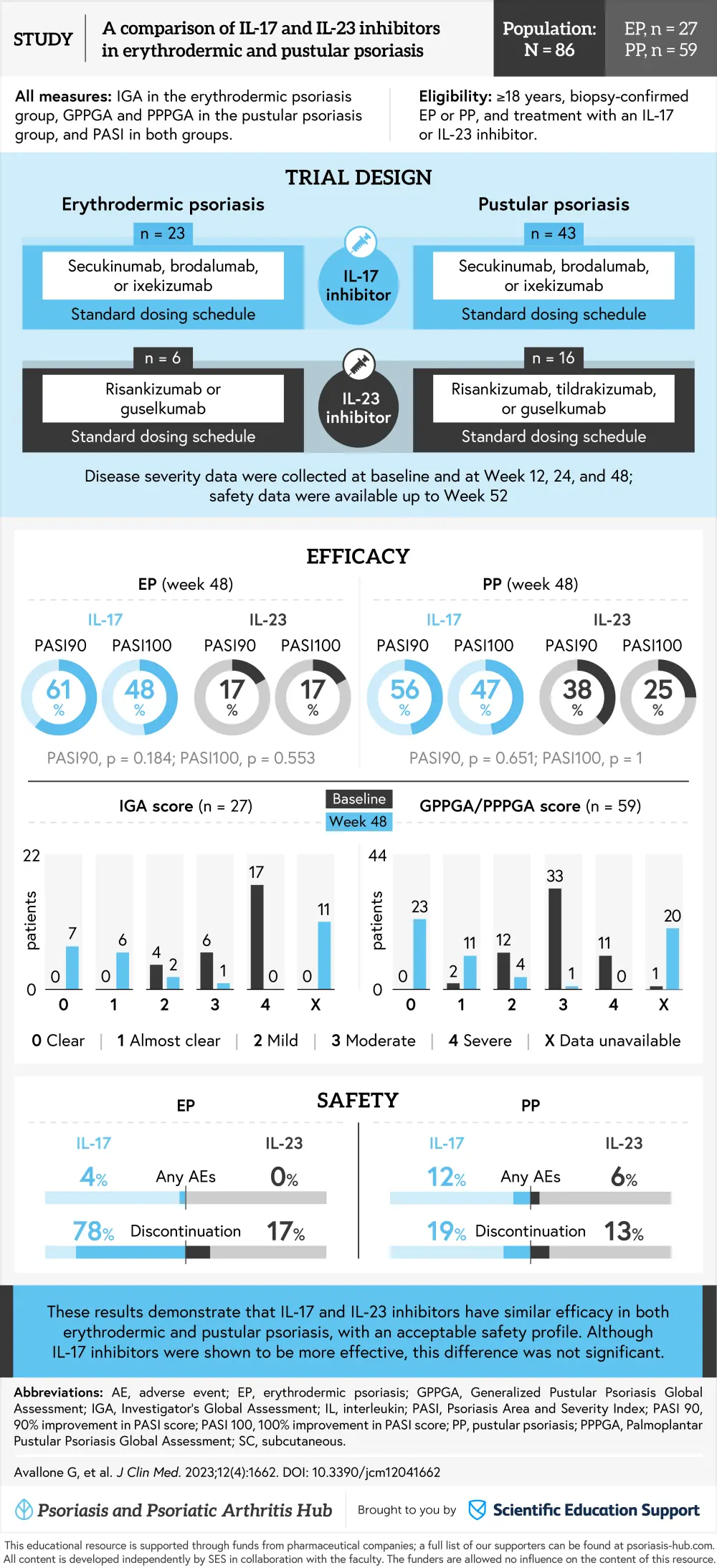 The Psoriasis and Psoriatic Arthritis Hub is pleased to present a visual abstract representing data from a multicenter, retrospective study that investigated the efficacy and safety of IL-17 and IL-23 inhibitors in erythrodermic psoriasis (EP) and pustular psoriasis (PP). Currently, data are lacking on the use of IL-17 and IL-23 inhibitors in these rarer forms of psoriasis, although there is evidence that IL-17 inhibitors can effectively treat both EP and PP.1
