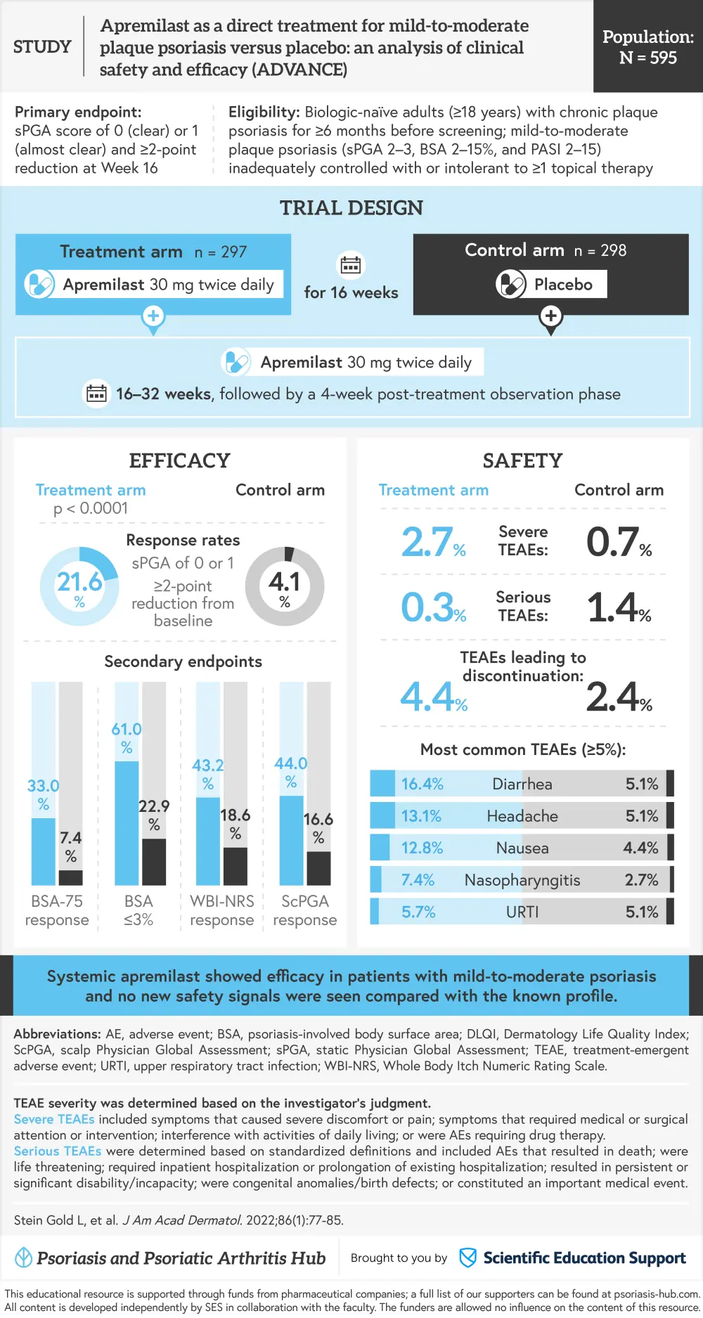 The Psoriasis and Psoriatic Arthritis Hub is pleased to present a visual abstract representing key data from the phase III ADVANCE trial (NCT03721172), which investigated the efficacy and safety of apremilast in patients with mild-to-moderate plaque psoriasis.1 This double blind, placebo-controlled trial investigated systemic apremilast in 595 patients with mild-to-moderate plaque psoriasis that was inadequately controlled or intolerant to ≥1 topical psoriasis agent.1